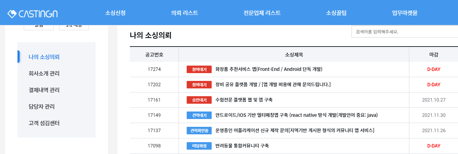 위시켓과 같이 역경매 방식으로 소싱업체와 연결해주는 플렛폼입니다. IT분야 뿐만 아니라, 비즈니스 대행업무도 연결해줍니다. 앱 개발사와 직접 연락하는게 아니라 캐스팅엔 담당자분에게 요구사항 및 개발 컨셉에 대해 설명해주시면, 담당자분이 알아서 적합한 개발사를 매칭해주기 때문에 커뮤니케이션에 부담이 없고 매칭된 개발사의 평점이나 포트폴리오도 볼 수 있어서 고객 입장에서는 편합니다.